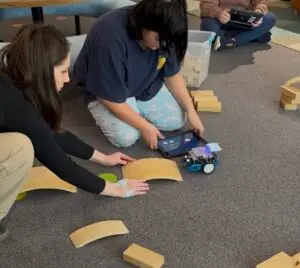The TIA for Chehalem ES, Joan Pape, was another early adopter who tested ways of using mBots. She shared both during the training day about how mBots allow students to learn the basics of block coding through built in drag and drop features, with advanced coding options with lots of variables. In her classroom, students practiced driving the robots, traversing obstacles, and testing different ways to cross under and over bridges. “What I really like is the tutorials built in to walk students through step by step. They might see another classmate get a robot to rotate after clapping and wonder how to do that. They can use the tutorials and figure out how to do it themselves, building skills around finding information themselves.”